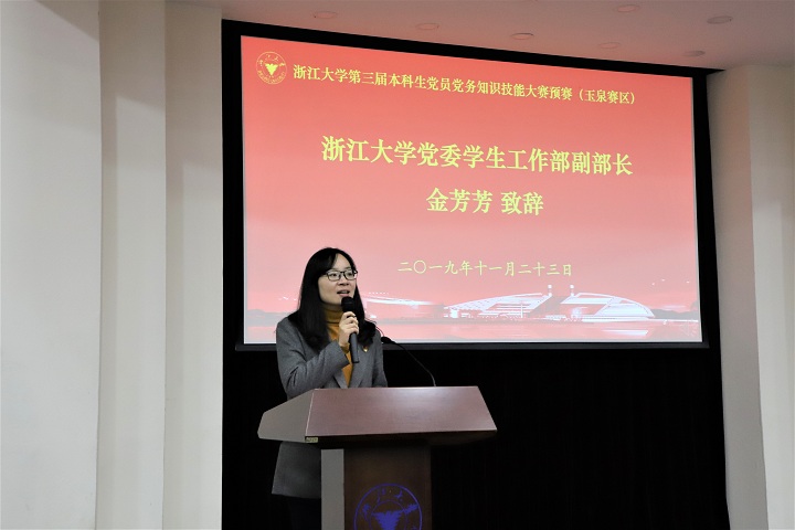 校党委学生工作部副部长金芳芳老师在致辞中表示,为学习贯彻习近平新时代中国特色社会主义思想,深化 “不忘初心、牢记使命”主题教育,学校特举办本科生党员党务知识技能大赛,希望以赛促学、以赛促进,进一步推进本科生的党建工作。她提到,学生党员是学生中的优秀代表,学生中的关键少数,也是学校基层党组织建设的重要力量。他们的工作能力直接影响支部建设的高度;他们的理论修养直接关系到支部学习教育的深度;他们的全情投入更是决定了支部大家庭的温暖。过去的两届比赛涌现出一批党务基础扎实,信念坚定,情怀高尚,全面发展的优秀党员骨干,相信今天也会涌现出一批优秀学生党员代表。