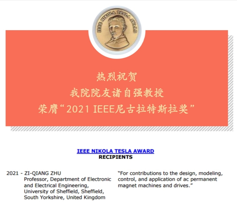 2020年7月1日, 2021年度IEEE尼古拉特斯拉奖揭晓,授予国际著名的电机及其控制系统专家、英国皇家工程院院士、美国IEEE学会会士和英国IET学会会士诸自强教授,以表彰他在交流永磁电机及其驱动的设计、建模、控制和应用方面做出的卓越贡献。
