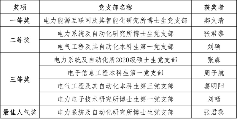 学院党委书记兼副院长汤海旸,学院党委副书记陈敏,校党委学生工作部思想教育办公室主任周伟辉,校党委研究生工作部思想教育办公室副主任朱杭,学院电机工程学系(电自)教工党支部书记江道灼,学院党委委员、应用电子学系教工党支部书记杜丽,学院党委委员、电工电子基础教学中心教工党支部书记潘丽萍和学院机关党支部书记贾爱民受邀担任本次大赛的评委。此外学院本科生党建工作指导委员会、研究生党建工作指导委员会委员、各学生党支部书记、委员、2020-2021学年第一期积极分子培训班学员到场观摩。