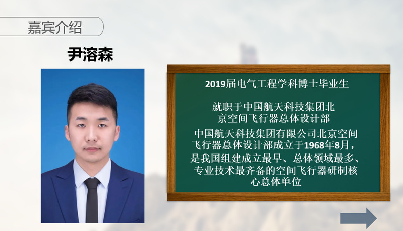 尹溶森学长做了有关在国家重点单位工作的经验分享。学长首先带着大家走进北京空间飞行器总体设计部(501部),讲解了他所在单位的主要业务与产品、所取得的航天领域成就。501部是航天技术创新的“引擎”、航天核心人才的“摇篮”、航天三大精神的“凝聚地”,有体系化的培养机制和开放式的成长平台。学长认为航天体系是一个庞大的工程,任务很艰巨,每一个任务被拆分得很细,需要很多人共同努力将一件事情办好。学长特别指出企业文化在择业过程中的重要性。