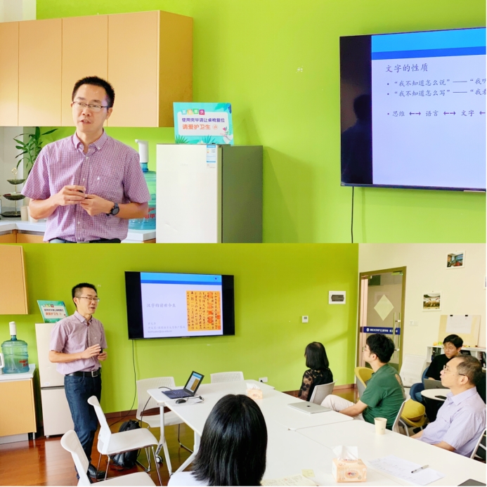 罗天华副教授首先介绍了汉字的起源,以古语“且言者意之声,书者言之记”,概括说明文字的性质是思维二级符号,文字分为表音和表意文字两大类,其中英语为表音文字,而汉字则大部分为表意文字,少部分形声字为表音文字。随后,罗天华副教授重点讲述了汉字形体的演变,分别介绍了古文字中的甲骨文、金文、小篆以及今文字中的隶书、楷书、草书、行书,甲骨文主要刻写在龟甲兽骨上,用于记录占卜;而金文主要刻于青铜器上,用于记录交易行为;小篆则是古文字的最后一代,其是秦始皇统一六国后推行的标准字体。罗天华副教授还带领老师们认读不同阶段的汉字,如早期的甲骨文、西周的《五祀卫鼎铭文》、唐代张旭的《肚痛帖》、西晋王献之的《鸭头丸帖》等,这个过程其乐融融,不时哄堂大笑。最后罗天华副教授以汉字的简化收尾了此次讲座,并指出汉字将会朝着规范化、科学化甚至拼音化的方向走向未来。