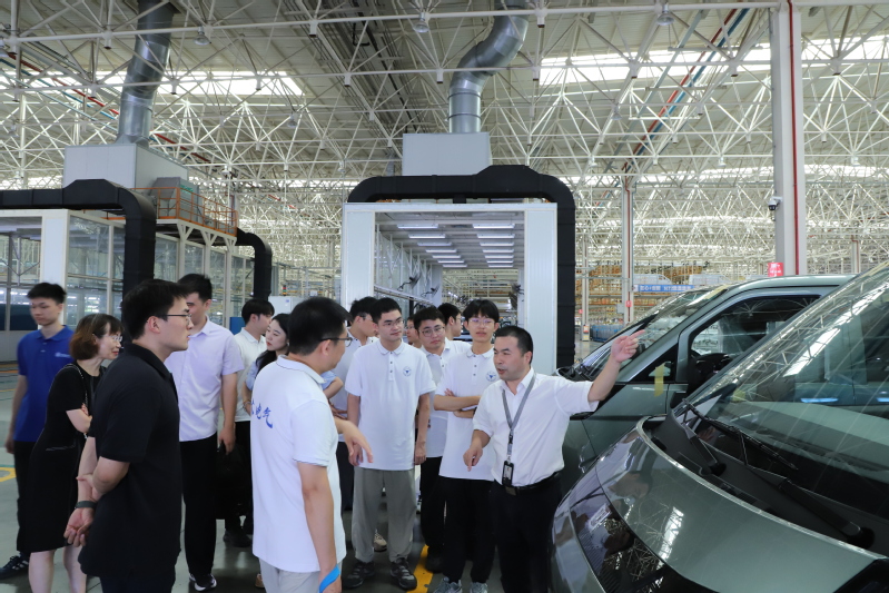 24日上午,实践团首先前往吉利四川商用车有限公司交流参观,企业经理向大家介绍了公司的主要业务范围和技术特点,并带领实践团参观了新能源商用车生产线。参观期间,同学们对汽车产业链的后桥封装线和底盘线生产技术产生了浓厚兴趣,就此杨欢老师与同学们针对汽车的动力组成和转向控制方法等与电气学科相关的领域知识进行了热烈讨论。