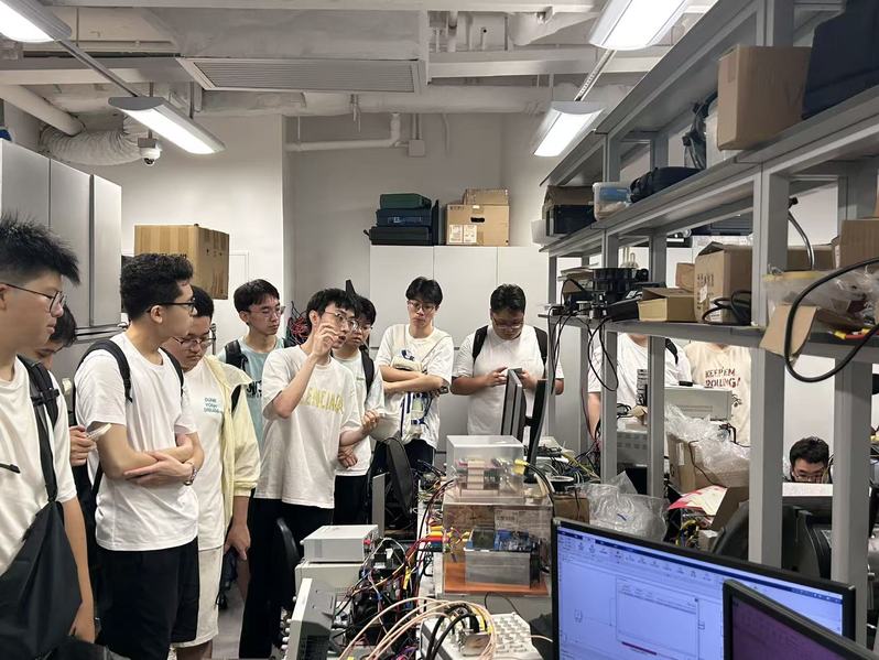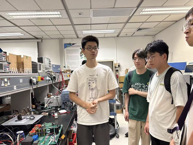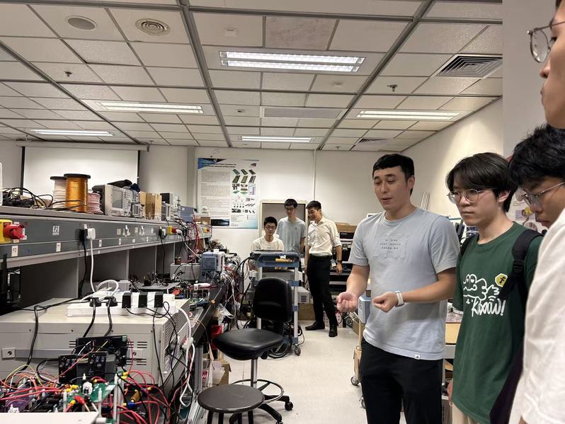 团队访问了香港理工大学,电机及电子工程学系助理教授刘伟、詹皓岚博士等进行了接待,介绍了该系的前沿研究,并带领同学们参观了实验室。刘教授所在的电动车研究中心(RCEV)由陈清泉院士引领,专注于电动汽车高效能电能变换及无线充电技术的研发。实验室配备了先进的电机系统、无线充电及功率电子技术实验平台,为技术测试与优化提供了强有力的支持。刘教授详细介绍了实验室的研究方向,包括融合电机驱动与无线传输的无线电机技术,以及针对多层停车场等特定场景的无线充电技术,探索智能无线能量网的未来前景。刘教授实验室的成员为同学们深入讲解了当前的研究方向,如氮化镓材料的应用研究、半导体封装技术的最新进展等。