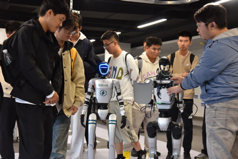 紧接着是人工智能实验室实操训练。在人工智能实验室,同学们进行了四足机器人基本运动控制、人形机器人远程遥操作功能体验、跨区域巡检任务仿真智能巡检系统场景解析等实践操作,将具身智能在电力场景的应用从概念变成“可触摸、可操作”的真实体验。